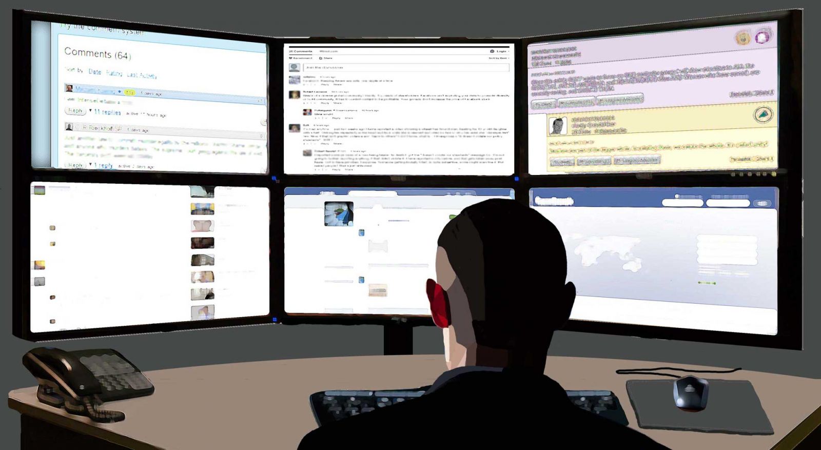 Reprodução gráfica do que seria uma destas estações de trabalho troll, de acordo com o testemunho de Corey.